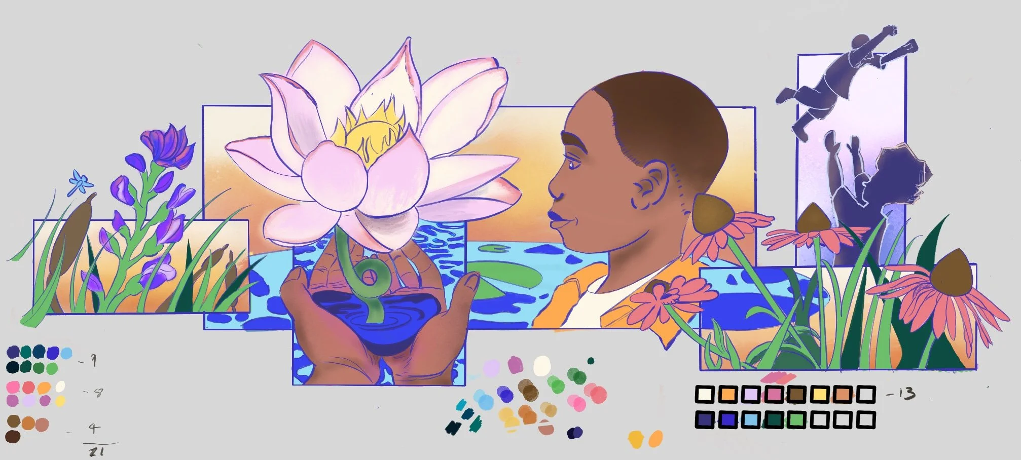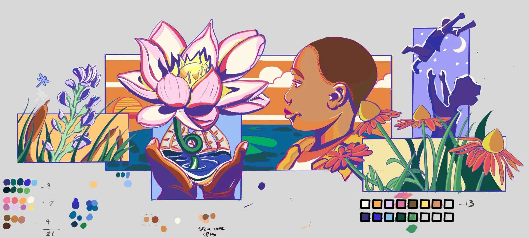 Over several sessions of interviewing the children of the Buckeye Ranch and neighboring schools and centers such as the boys and girls club, sharing my art pieces and story to spark inspiration to create and imagine. I started initiating drawing sessions in which myself and the community could design the features and themes of the mural together.